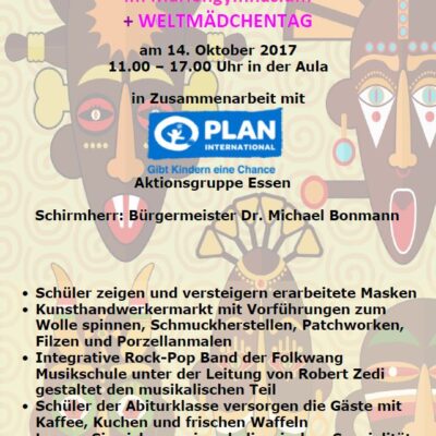 AG Essen: Teilnahme am Welt-Mädchentag mit Kunst, Kultur, Musik und Kulinarisches im Essener Mariengymnasium am 14. Oktober von 11 bis 17 Uhr in der Aula. Mehr Infos unter essen.plan-aktionsgruppen.de.