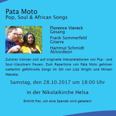 AG Helsa: Benefizkonzert Pata Moto - Pop, Soul & African Songs am 28. Oktober um 18 Uhr in der Nikolaikirche Helsa. Der Eintritt ist frei, um Spende wird gebeten. Für mehr Infos kontaktieren Sie bitte die Aktionsgruppe.