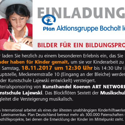 AG Bocholt: Kinder malen für Kinder. Versteigerung der, in einer Kunstaktion der Aktionsgruppe Bocholt in Zusammenarbeit mit dem Kunsthandel Koenen ART NETWORK und der Kunstschule Lajewski entstandenen, Gemälde. Der Erlös geht an das Plan-Projekt gegen Kinderarbeit in Tansania. Die Versteigerung findet am 18. November von 12.30 bis 14.30 Uhr in der Volksbank Bocholt, Hauptstelle, Meckenemstr. 10 statt.…