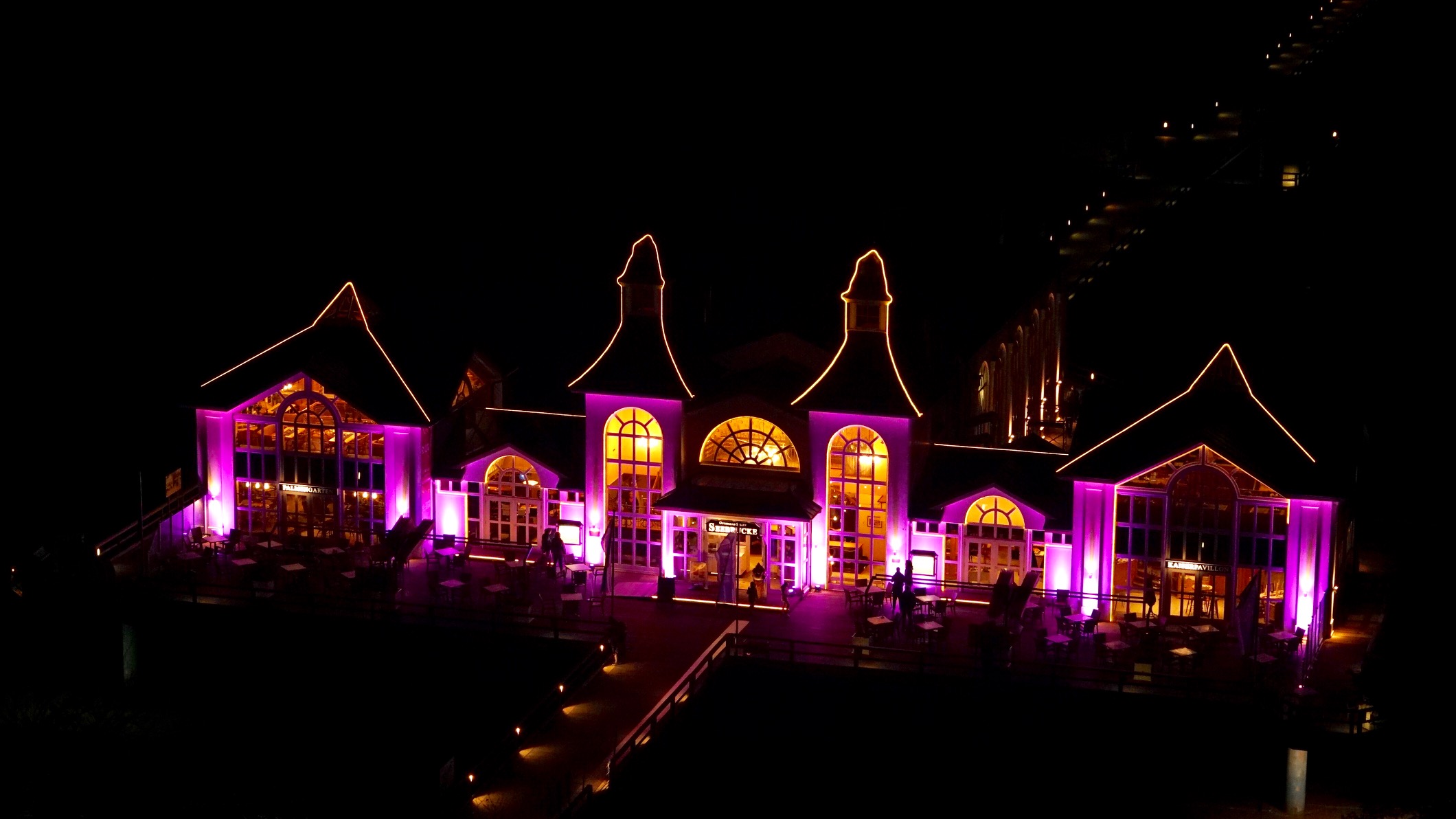 Die Seebrücke war bereits am Vorabend des 11.Oktober mit pinkfarbenem Licht geschmückt und leuchtete bis in die Nacht zum 12.10. weithin sichtbar. Noch in den späten Abendstunden des 11.Oktober sahen wir viele Menschen, die ihre Kameras zückten und fotografierten. Also, zu sehen waren wir auf jeden Fall!!!