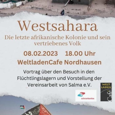 AG Nordhausen Am 08.Februar um 18.00 Uhr lädt das WeltladenCafe Nordhausen (facebook) zu dem Vortrag "Westsahara - Die letzte afrikanische Kolonie und ihr vertriebenes Volk" ein. Die Vortragende ist Mitglied der AG und berichtet über den Besuch in den Lagern für Geflüchtete und stellt die Vereinsarbeit von Salma e.V. vor.