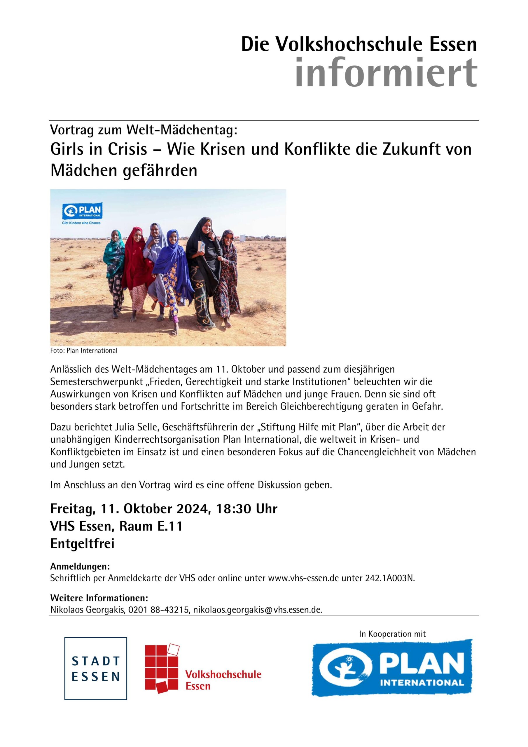 AG Essen: Am Freitag den 11. Oktober um 18:30 Uhr lädt die AG in die VHS Essen, Raum E.11, Eintritt frei um Anmeldung online unter www.vhs-essen.de unter 242.1A003N wird gebeten. Titel: Girls in Crisis - Wie Krisen und Konflikte die Zukunft von Mädchen gefährden. Vortragende: Julia Selle, Geschäftsführerin der Stiftung Hilfe mit Plan Im Anschluss…